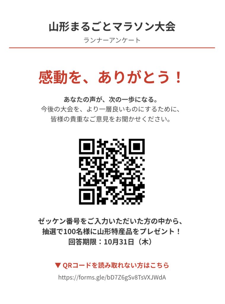 この度は「山形まるごとマラソン」にご参加いただき、誠にありがとうございました。ランナーの皆様、心より感謝申し上げます。